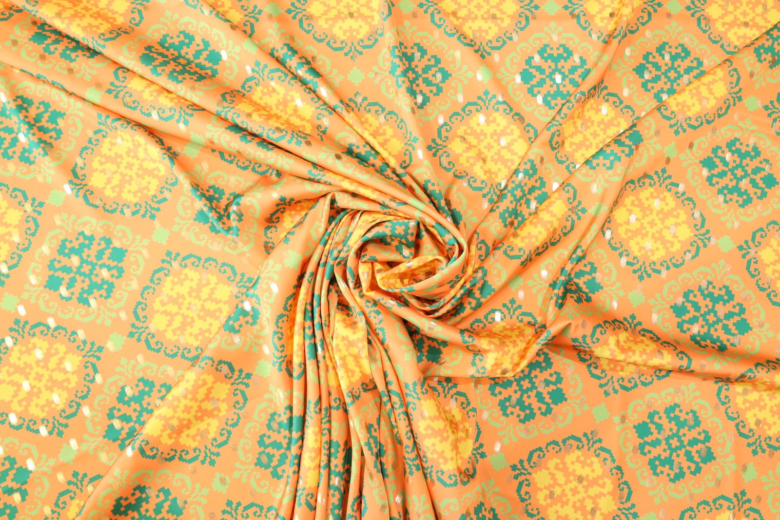 قماش منقوش مشمشي دافئ يجمع بين الدفء والرقة في تصميم متقن يضيف لمسة جمالية راقية على أي قطعة تصميمة. اللون المشمشي الدافئ مع النقوش المتقنة يجعل القماش مثاليًا للأزياء المميزة والديكورات التي تبحث عن لمسة أنيقة ومريحة.